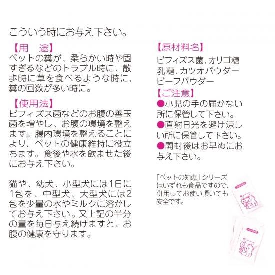 ◎ビフィズス菌などお腹の善玉菌が増えることにより腸内環境を整えペットの健康を維持します。