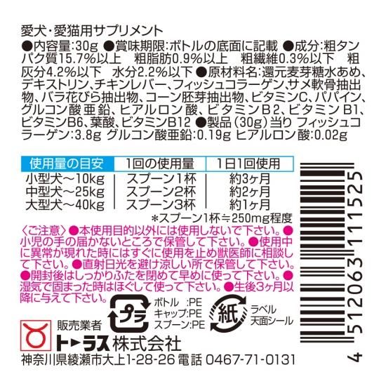 還元麦芽糖水あめ/デキストリン/チキンレバー/フィッシュコラーゲン/サメ軟骨抽出物/バラ花びら抽出物/コーン胚芽抽出物/ビタミンC/パパイン/グルコン酸亜鉛/ヒアルロン酸/ビタミンB2/ビタミンB1/ビタミンB6/葉酸/ビタミンB12